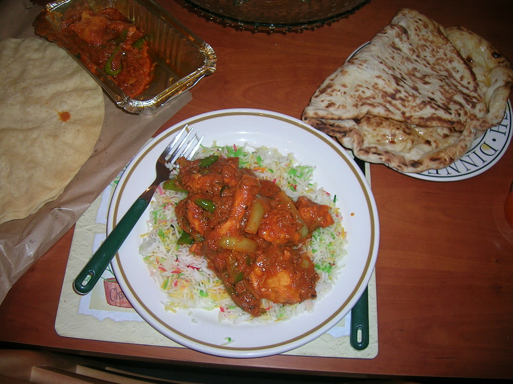 Medium to hot dish cooked in a thick sauce with fried sliced green peppers and onions and green chillies.